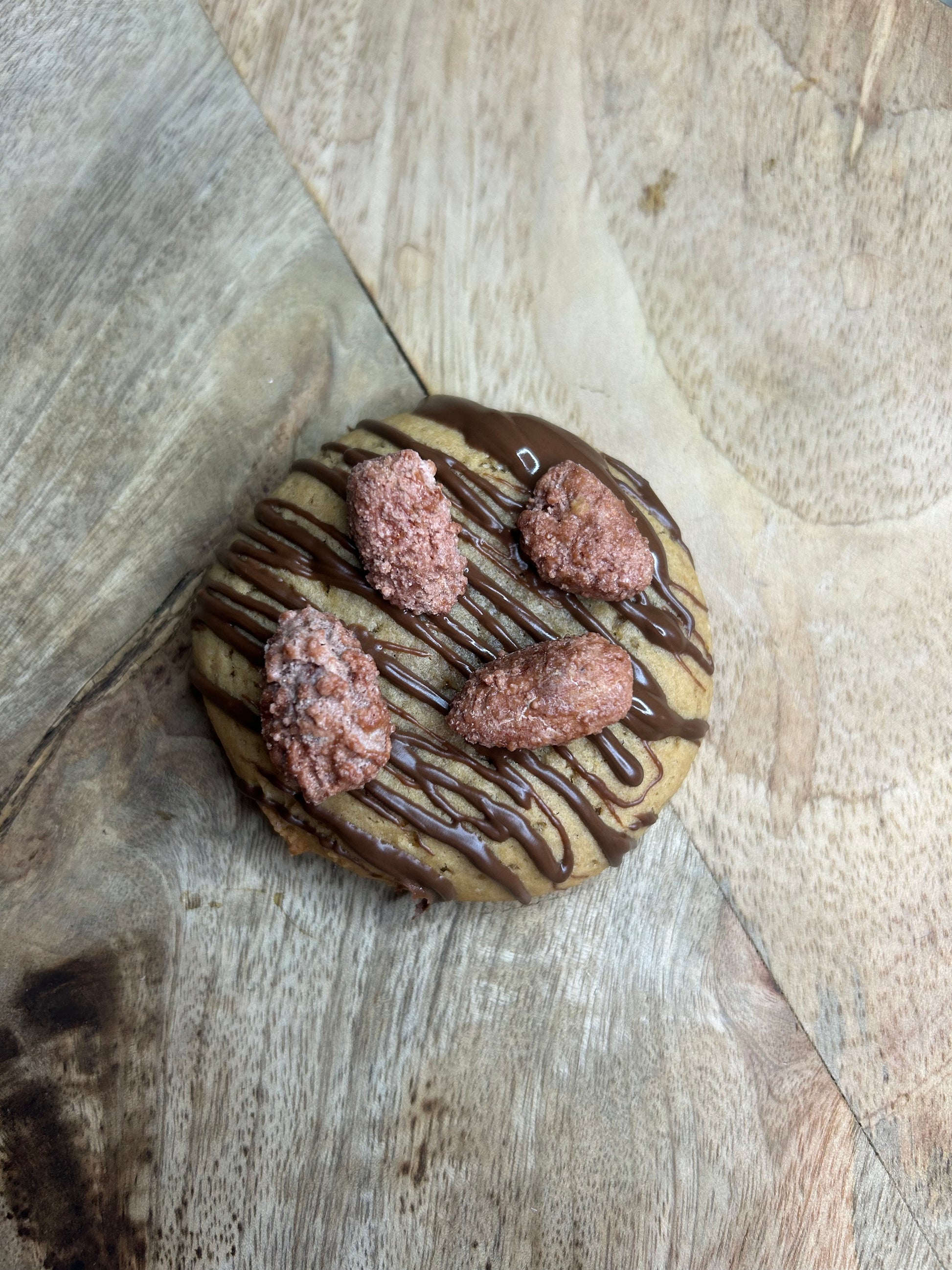 Délicieux cookie aux pépites de chocolat au lait, coeur praliné maison, chouchous d'amande maison.