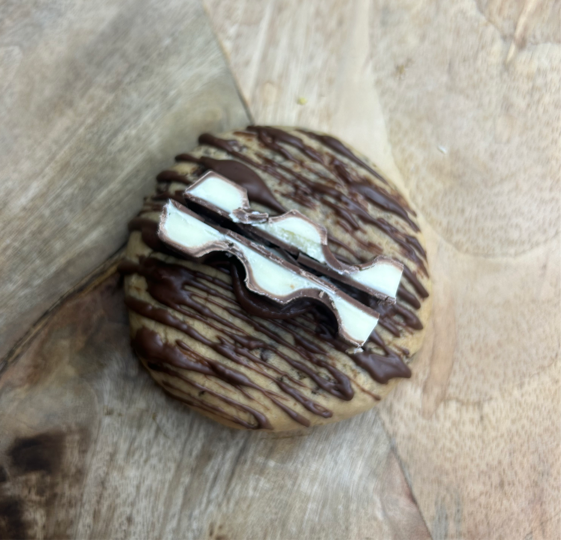 Délicieux cookie aux pépites de chocolat au lait, coeur Nutella fondant et Kinder maxi.